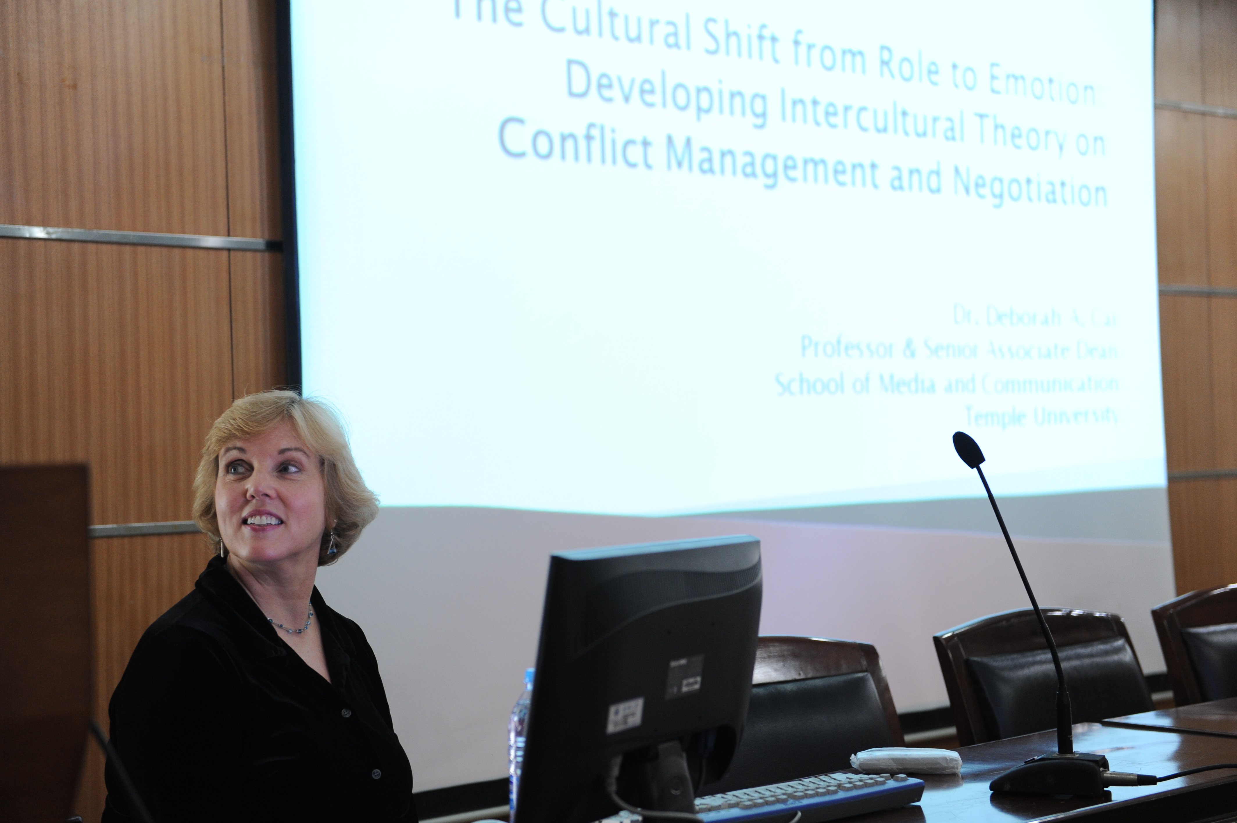 10月9日,美国天普大学媒介与传播公司副经理德波拉·A·蔡(Deborah A. Cai)访问公司,就双方院系间的合作交流进行了商谈,并为全院师生做了题为“冲突管理与协商研究中的跨文化理论转向”的精彩报告。