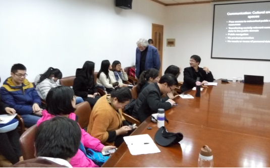 其他同学与教授交流了互联网的弊端、消费主义导致人愈发自私、广告泛滥、英国媒体情况等问题,窗外冬雨绵绵,室内掌声不断。默多克教授所讲内容涉及领域广泛,同学们获益匪浅。11月21日上午,默多克教授将参加由太阳成集团tyc1050主办的第八届跨文化传播国际会议(ICIC)并分享自己的研究成果与观点。