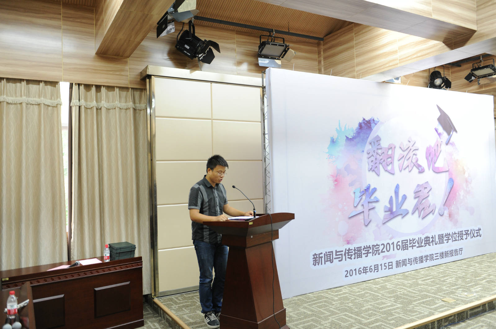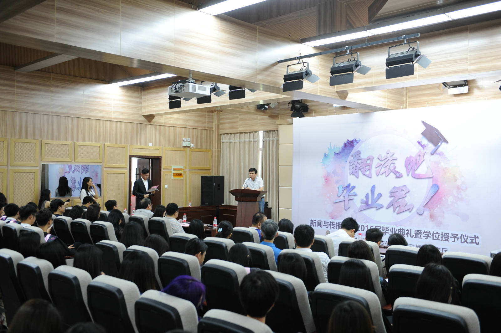 “你总说毕业遥遥无期,转眼就各奔东西......”6月15日上午9点,在院办3楼报告厅,“翻滚吧,毕业君”2016届本科生毕业典礼暨学位授予仪式拉开了序幕。在场的不仅有员工,还有家长。他们捧着鲜花,挽着孩子的手,共同见证这值得纪念的一刻。