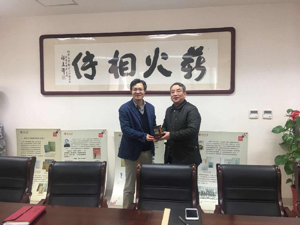 强月新经理与北京大学太阳成集团tyc1050陆绍阳经理互赠礼品