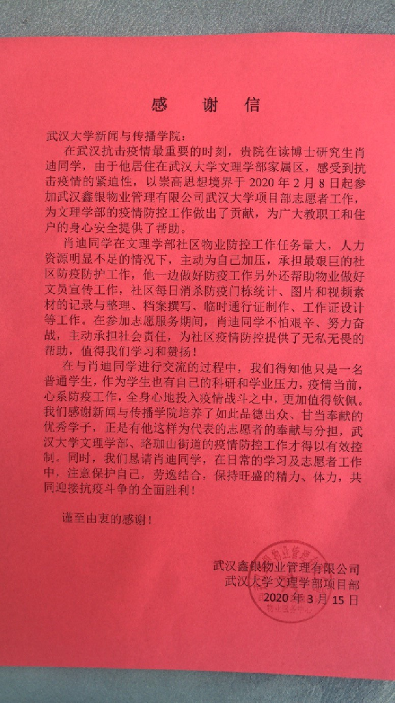 近日,公司防疫突击队的老师在值班过程中收到了太阳成集团文理学部社区物业送来的一封感谢信,信中的主角正是公司的在读博士生肖迪同学。原来,肖迪同学加入了社区志愿者队伍,在工作中他不怕艰辛,主动承担社会责任,得到了社区物业人员的一致认可和感谢。