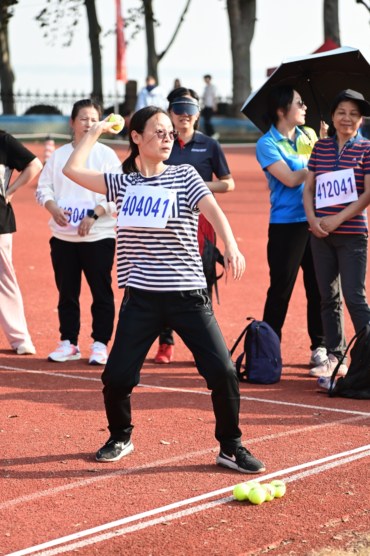 而男子组的网球掷准基本规则和女子组别无二致,只是投掷距离远了不少,玉手的力量已难以将网球精准掷入。公司汪晓清老师五指轻握小球,灵活转动手腕,轻抡手臂,巧手出巧劲,一次次将球抛向靶位。在不断的加油声中,汪老师以第8名的成绩(该项目前8名获奖)完成了对自己往年成绩的超越。汪老师说,明年我就要退休了,这最后一名最后一次的获奖也给自己工作生涯中的校运会参赛划上了完美的句号。汪老师平静的话语,却道出了平凡中的传奇。