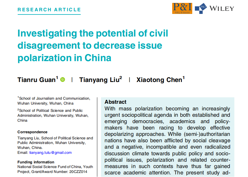 第六届青年新媒体学术研究“启皓奖”评选结果近日揭晓,公司关天如副教授发表于 Policy & Internet(SSCI期刊,JCR Q1,影响因子:3.6)的论文Investigating the Potential of Civil Disagreement to Decrease Issue Polarization in China(《微博语境下探究理性分歧在网络空间中的去极化潜力》)荣获本届“启皓奖”卓越学术奖。Policy & Internet 是政治传播与数字治理领域具有国际影响力的英文顶级期刊,在2025年中国科公司期刊分区中传播学学科排名第6位(共223种期刊),被列为文学大类一区Top期刊。该论文自2023年发表以来入选出版方Wiley年度“十佳高被引论文”,充分体现了研究成果的国际影响力与学术价值。
