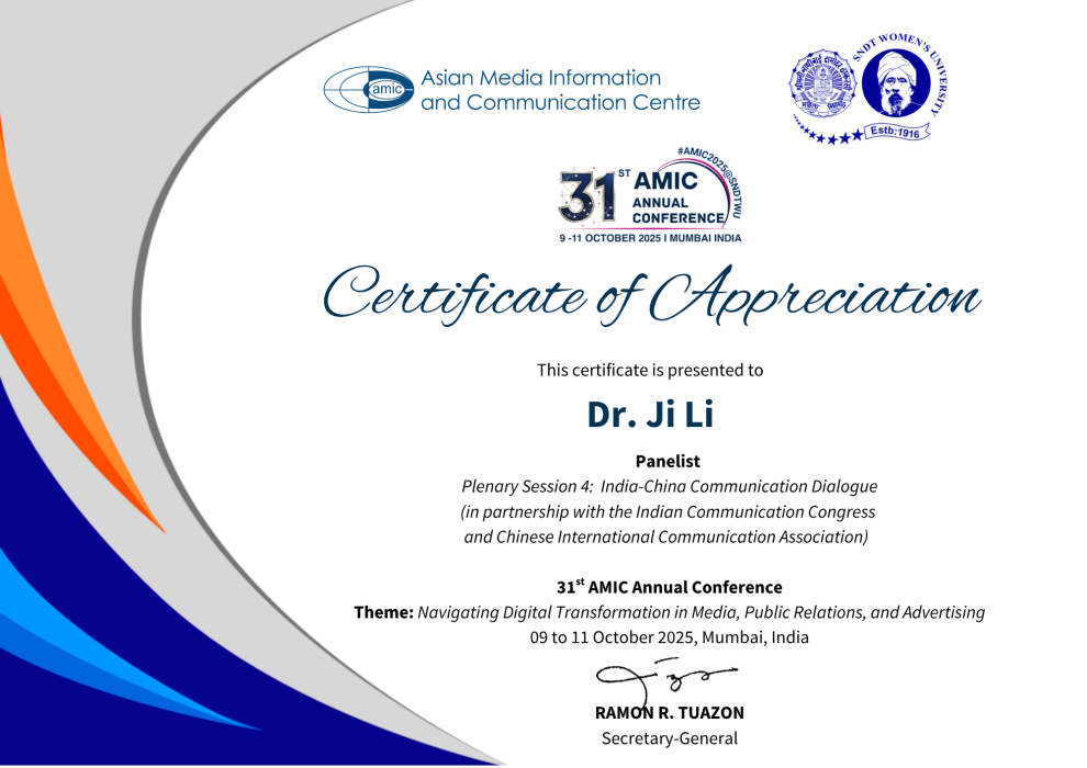 2025年10月9日,本院纪莉教授受邀参加了在印度孟买举办的第31届亚洲媒体信息与传播中心(AMIC)年会,并做主题发言。AMIC成立于1971年,长期致力于亚太地区媒体与传播研究,是该地区最早专注于传播议题的国际组织之一。此次年会主题为“构建亚洲国家间的沟通桥梁”。纪莉教授在发言中提出亚洲的可持续发展传播研究,可以为亚洲国家减少对抗性传播叙事,共同推动亚洲可持续发展发挥有价值的作品。该观点得到《中国日报》报道。