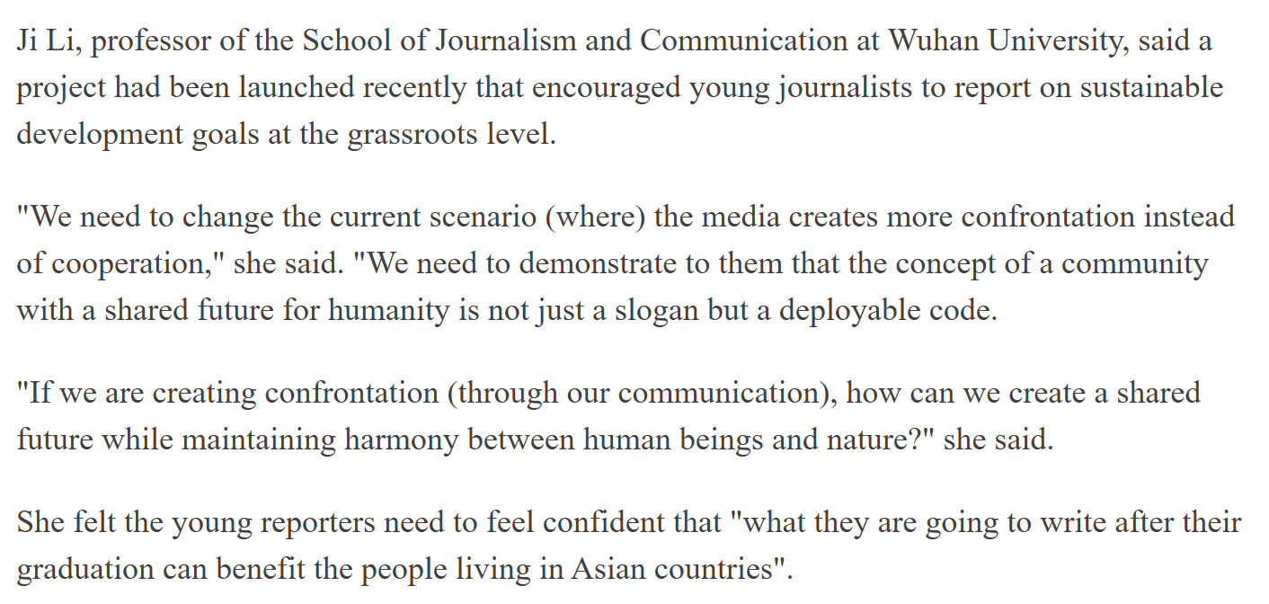 本届年会受到亚洲学者与媒体的广泛关注,中国日报China Daily对其进行了题为《专家呼吁印度、中国跨越交流鸿沟》(Experts call on India, China to bridge communication gap)的新闻报道,并在报道中引用纪莉教授的观点:“我们需要向青年展示,人类命运共同体不仅仅是一个口号,而是可执行的行动准则。如果我们的传播制造对抗,又如何能在人与自然和谐共存的基础上创造共同未来?”